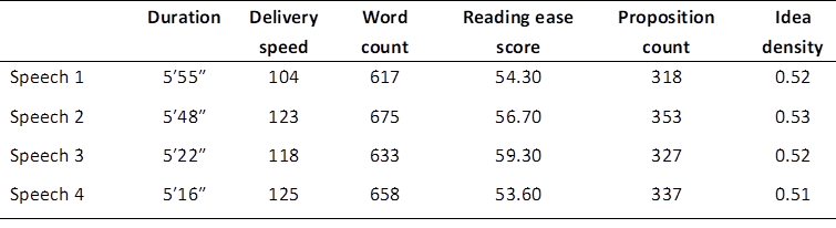 Note: “Delivery speed” was measured in words per minute (wpm) and “idea density” was measured in propositions per word (ppw).