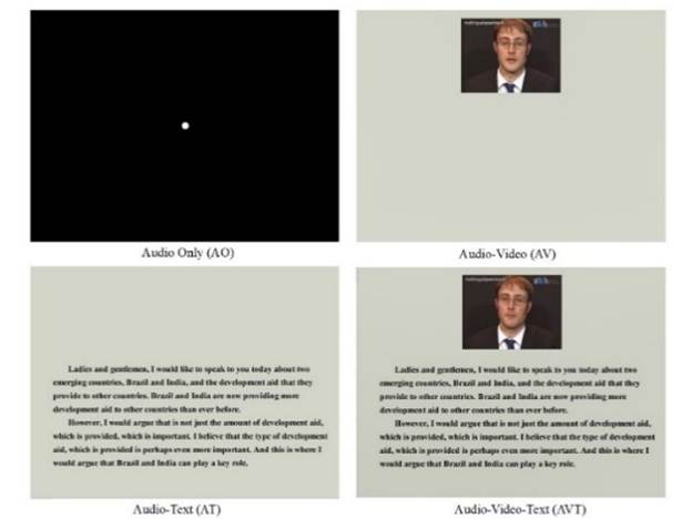 Four experimental conditions (see Table 2 and Figure 1) for each of the speeches were created by using Jiangying and Adobe Photoshop: speech with audio input (AO) only; speech with audio and video of the speaker (AV); speech with audio and written text (AT); and speech with audio, video of the speaker, and written text (AVT). In the AO condition, the participants heard the speech of the video only while they saw a white dot on the screen (Drijvers & Holler, 2023). In the AV and AVT conditions, the video of the speaker was shown in the top third of the screen; the verbatim transcript was displayed in the lower two-thirds of the screen (Seeber et al., 2020). The verbatim text varied with the speaker’s speech stream. The verbatim transcript, designed partially to mimic the presentation format of InterpretBank Model 1, preserves the informational context so as to mitigate semantic ambiguity (Defrancq & Fantinuoli, 2021). Although Model 1 may provide excessive visual information for interpreters, empirical evidence from the CASI interface usability study indicates a practitioner preference for information-rich interfaces (Saeed et al., 2023).