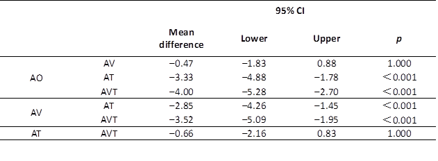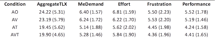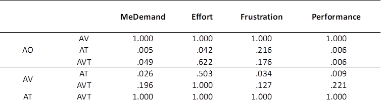 A closer inspection of the subscales of cognitive load found that differences exist in every subscale (Table 6). This means that the participants experienced the lowest mental load and felt the most successful in the AT condition. They devoted the most effort in the AO condition and experienced the most frustration in the AV condition.