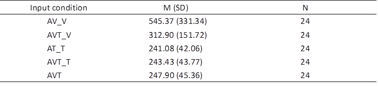 Descriptive statistics on AFD (ms) in the AV, AT, and AVT conditions