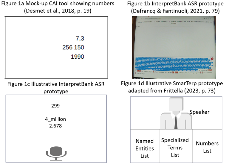 Furthermore, the integration of artificial intelligence (AI) and ASR has initiated a new phase in CAI tool development. Recent research highlights the potential of these technologies to enhance the adoption of CAI tools in interpreting practice (Fantinuoli, 2023; Frittella, 2023; Prandi, 2023). Various implementations of ASR-integrated CAI tools have been explored in recent research. For instance, Desmet et al. (2018) used PowerPoint slides to simulate an ASR-enhanced CAI tool for number recognition (Figure 1a). The InterpretBank ASR prototype has demonstrated several visualization approaches, including full transcripts with highlighted numbers and terminology (Figure 1b) and focused number displays (Figure 1c) (Defrancq & Fantinuoli, 2021; Desmet et al., 2018). Other designs have featured displays of key terminology, numerical data, and named entities (Figure 1d) (Frittella, 2023). These developments align with the emerging concept of augmented interpreting, which emphasizes human–machine collaboration as a defining element of future interpreter workflows (Fantinuoli, 2023; Fantinuoli & Dastyar, 2022).