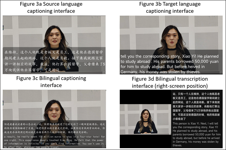 For automatic transcription, we employed iFlyrec,[2] which was selected for its Chinese language accuracy and flexible interface options. As shown in Figure 3, this tool offers various customizable features, including display options in the SL (Figure 3a), automatically translated TL (Figure 3b), and a bilingual format (Figure 3c). These displays can be positioned anywhere on the screen, adjusted for font style and size, and formatted to suit user preferences. According to the iFlyrec specifications, the tool achieves a word error rate (WER) of 2% and a transcription latency of 0.2 seconds.