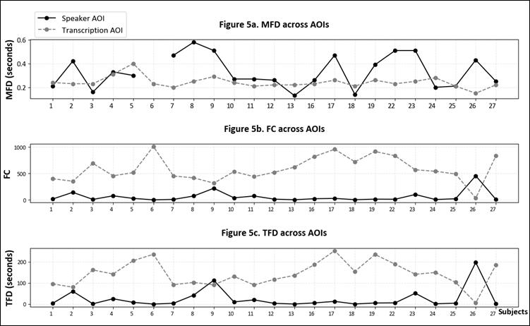 In Figure 5, we observe that the MFD is generally higher in the speaker AOI (M = 0.33, SD = 0.14) compared to the transcription AOI (M = 0.24, SD = 0.05), with 15 out of 22 valid MFD data points following this trend. This suggests that the participants spent longer fixating on the speaker than on the transcription. However, for both FC and TFD, the opposite pattern emerged. The transcription AOI had consistently higher FC (M = 584.78, SD = 243.91) compared to the speaker AOI (M = 59.04, SD = 101.55), except in the case of Subject 26. Similarly, the TFD for the transcription AOI (M = 142.54, SD = 58.98) exceeded that of the speaker AOI (M = 24.96, SD = 45.99), except for Subjects 9 and 26. The inverse relationship between FC and TFD across AOIs suggests a limited attention resource model, where increased attention to one channel necessarily reduces attention to the other. The combined fixation metrics indicate distinct viewing patterns across AOIs: shorter but more frequent fixations in the transcription AOI, contrasted with longer but less frequent fixations in the speaker AOI.
