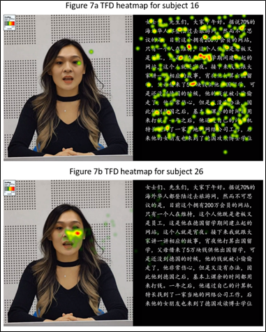 To illustrate these contrasting attention patterns in detail for the purpose of examination, Figure 7 presents TFD heatmaps generated by Tobii Studio for two representative subjects. The heatmaps employ a colour gradient from transparent through green and yellow to red, with increasing colour intensity indicating a longer fixation duration. Subject 16 exhibited a uniform distribution of fixations across the transcription AOI, with minimal attention being given to the speaker AOI; this suggests comprehensive use of visual–verbal information during SI. In contrast, Subject 26 concentrated their fixations almost exclusively on the speaker’s facial region, with minimal attention being given to the surrounding areas and negligible engagement with the transcription area; this indicates limited use of visual–verbal information during the SI process.
