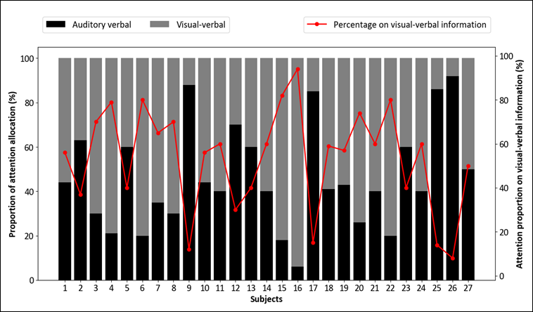 Whereas 18 of the 27 participants reported allocating the majority of their attention to transcription, this number was lower than that observed in the eye-tracking data. Nevertheless, certain patterns were consistent across both the objective and the subjective measures. For instance, Subjects 9 and 26 demonstrated the lowest transcription attention allocation in both the eye-tracking data and the self-reported measures. Regarding their attention-allocation strategies, eight participants, including Subjects 9 and 26, reported deliberate strategic allocation, whereas the remaining 19 participants described their allocation as automatic behaviour.