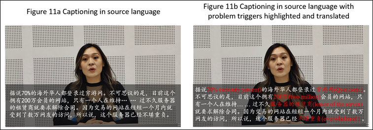 Regarding their future CAI tool preferences, computers emerged as the preferred device (56%), followed by tablets (22%), and telephones (12%). The display preferences showed a clear inclination towards captioning in the lower half of the screen (70%), with the remaining 30% favouring vertical positioning similar to that in the experimental setup. Their content preferences revealed that 77.8% of the participants (21 subjects) emphasized the importance of source speech transcription. In this group, 10 participants expressed an interest in integrated source language (SL) and the interpretation of problem triggers, similarly to the Cymo[5] tool interface presented in Figure 11b. Eight participants preferred source speech transcription alone (Figure 11a) whereas equal numbers (three participants each) favoured bilingual content, TL only, or problem trigger information exclusively.