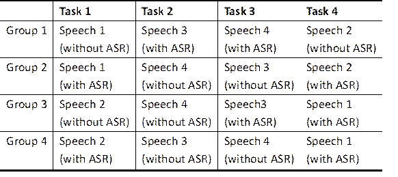 A group of advanced interpreting students interpreted four speeches consecutively from their B language into their A language – two featuring a challenging accent and two without. Each interpreter had to work with two speeches with ASR assistance and two without, each speech having been assigned to only one condition per interpreter. The participants’ CI performances and cognitive loads were to be compared between the two ASR conditions and also between the two accent conditions in order to respond to the two research questions. Their CI performance was assessed using four criteria: