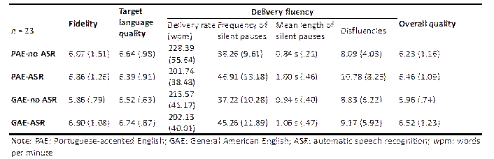 No statistically significant impact of ASR was observed on the overall quality of the CI output, and there was no interaction between ASR and accent on this metric. This may not come entirely as a surprise, as the improvements in fidelity brought about by ASR may have been offset by the negative impact on fluency. Previous research has shown that fluency plays a key role in the way interpreting quality is perceived, with clients often prioritizing smooth delivery (Macías, 2006). In fact, perceived fluency is often linked to users’ assessments of accuracy (Rennert, 2010). For this reason, when experts subjectively assess overall quality, they may subconsciously “penalize” disfluent renditions despite a high level of information completeness and accuracy. This underscores the importance of balancing accuracy and delivery smoothness in interpreting training.