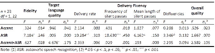 One participant’s data were not accepted for analysis due to the failure to record their interpreting performance. Repeated-measures ANOVAs were carried out on different indicators of interpreting performance and cognitive load separately, with accent and ASR assistance as within-subject factors. Greenhouse-Geisser correction was adopted to obtain the adjusted critical values when an assumption of sphericity was violated. When significant interaction between the two factors was found to exist, simple effect analysis would be conducted with Bonferroni correction applied.